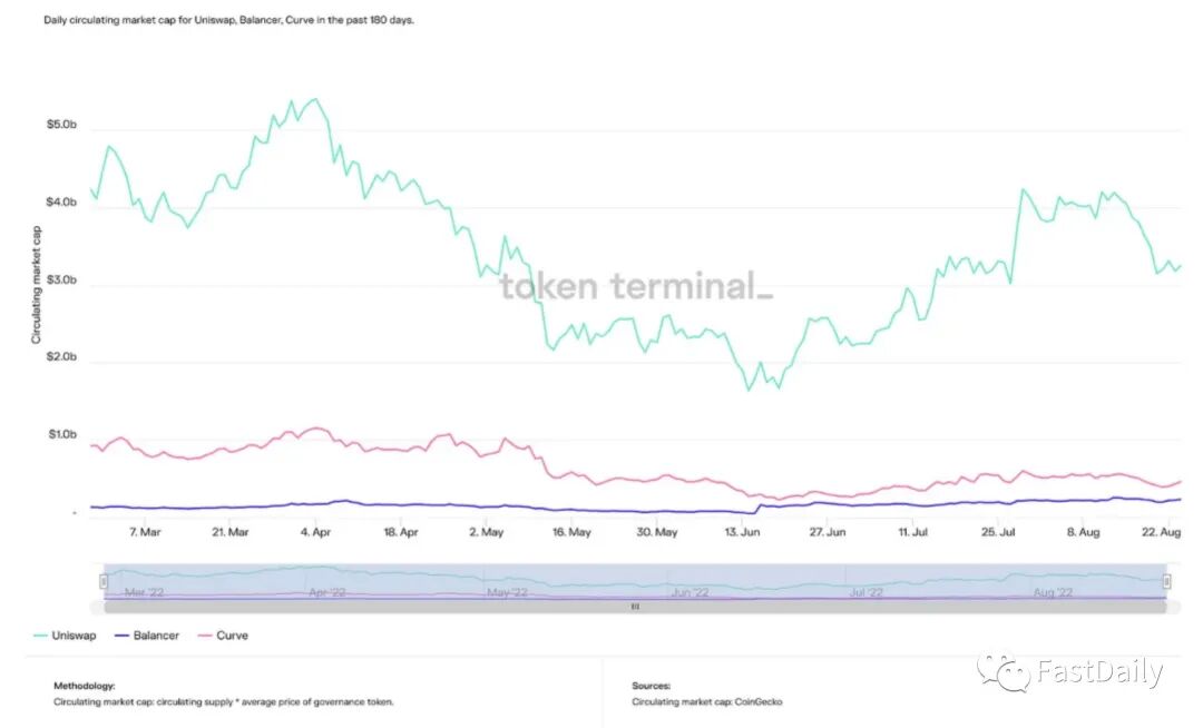 在撰写本文时,Curve的TVL确实比Uniswap高出5亿美元,尽管其峰值TVL是后者的两倍多。然而,在总销量、营收和市值等各种其他指标中,Curve始终位于Uniswap之后。
