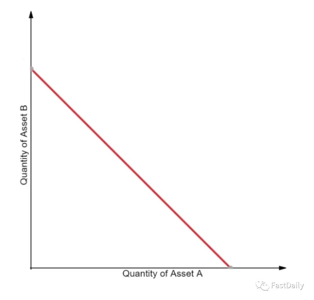 其中x是代币1,y是代币2,k是常数。根据这个公式可以绘制出一条直线。