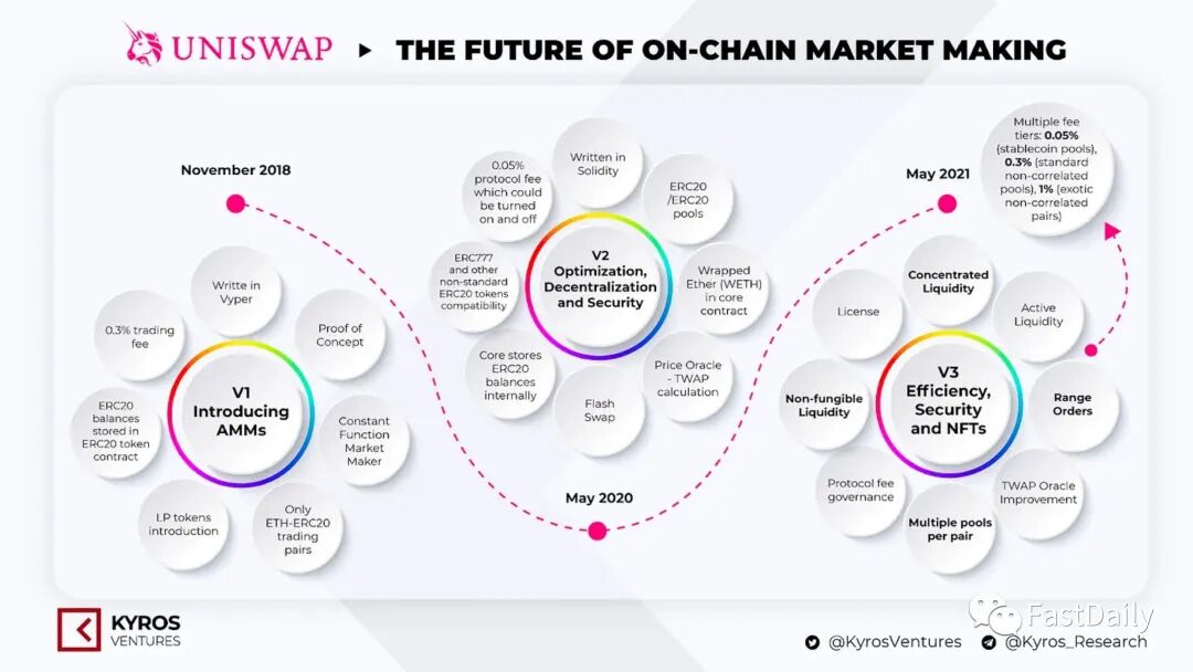 之前,我们讨论了Uniswap的推出及其在市场上的主导地位。在2020年5月,Uniswap推出了他们的第二个版本Uniswap V2,该版本引入了ERC20对、价格oracles、flash swap以及其他各种技术改进。虽然这对平台来说并没有太大的变化,但这无疑是创新的一步。然而,之后的Uniswap V3创造了自动化做市商的新范式。