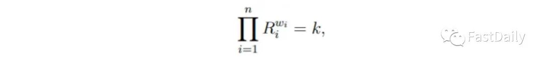 第一代AMM的第三种类型是由Balancer公司推广的CMMM。在这种AMM中,每个流动性池可以拥有比传统的两种更多的资产,并且可以不同于传统的50:50加权系统进行加权。最终,每个储备的加权几何平均值保持不变。CMMM满足以下公式:
