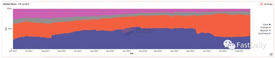 最终,Curve成为了第二代AMM的赢家。直到几个月前的市场大崩盘,Curve在总价值锁定(也被称为TVL,是衡量平台资产价值的指标)中所占比例仍然很高。