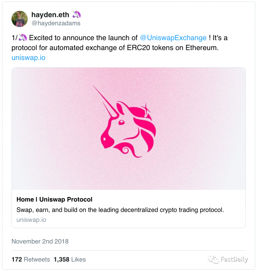 Vitalik的想法得到了广泛的关注,并被一个社区迅速跟进,两年后,他又发表了一篇后续文章,对去中心化交易所的实际运作进行了更多说明。几个月后,Hayden Adams宣布推出Uniswap协议,从而开始了第一代加密货币AMM。
