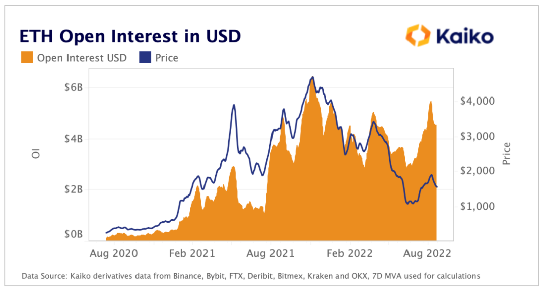 我提到,随着我们接近合并,资金比以往任何时候都更加凶猛地进入期货市场。未平仓合约是衡量当时有多少未平仓头寸的量度,代表当前投资于期货的资本金额。在我看来,查看资产原生单位(即以 ETH 计价)的未平仓合约很重要,因为以美元计价的未平仓合约会产生价格效应。如下所示,美元的未平仓头寸密切跟踪价格,并且通常难以显示期货市场中的资本流动。