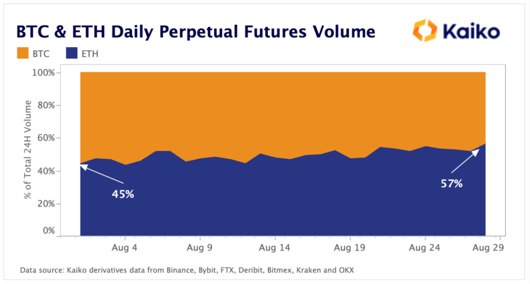 我们已经在 BTC 和 ETH 之间的永续期货交易量份额中看到了这一点,随着合并的临近,ETH 从在本月初占交易量的 45% 增加到 8 月底的 57%。