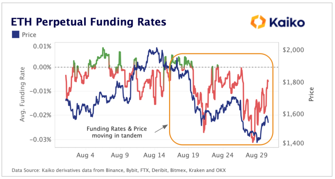 正如我们在下面看到的,空头头寸导致的负资金费率伴随着 ETH 从 2,000 美元的水平下跌,并与价格同步移动。如果这些空头在合并后被平仓,那么 ETH 资金费率可能会朝着积极的领域迈进,这肯定会有助于价格情绪。