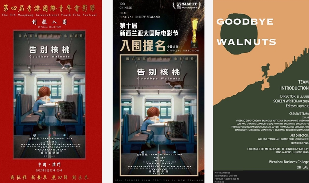 《告别核桃》就是第一个吃螃蟹的XR影片。该影片由温州商学院的XR_LAB团队打造,总时长约10分钟,已经入围了北美电影节、英国Lift-off Global Network、新西兰亚太国际电影节金蕨奖、香港国际青年电影节等多个海内外知名电影节提名。