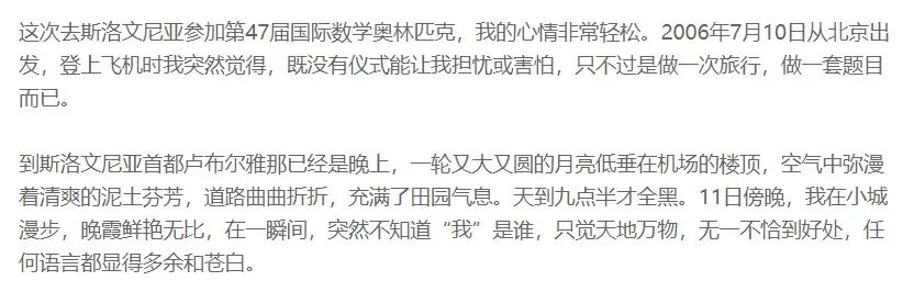 在培训班上,老师除了讲数学,还会讲数学背后的深刻哲学。每次上完课,柳智宇走过夜晚的繁华街道时,还在醉心回味着课上的细节。在他的文章中,他记录了当时的感受:「那是另外的一个世界,数学的世界,其中并没有凡庸琐碎的得失毁誉,只有自然的美、人类心智的美。」