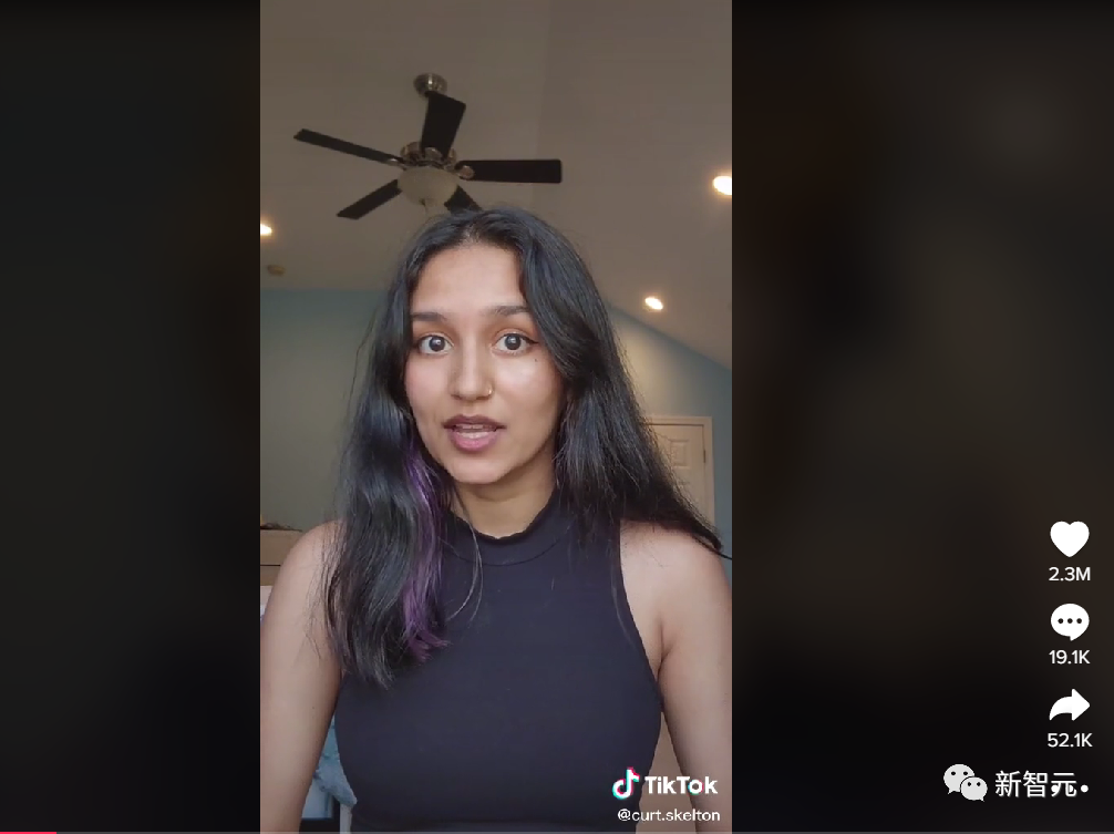 视频显示,据称在Curt Skelton背后的女人的声音,是一位名叫Zahra Hussain的女士,她家在新泽西州,今年21岁,是一位TikTok视觉效果艺术家,她参与了创作Skelton的演讲。