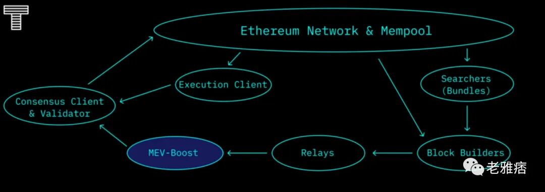 那么它是如何运作的呢?PoS节点运营商必须运行三个软件:验证者客户端、共识客户端和执行客户端。MEV-boost可以被认为是共识客户端的“sidecar”,它可以查询并将构建区块的工作外包给建设者网络。区块建设者将准备完整的区块,优化MEV提取并公平分配奖励。然后他们将区块提交给中继者。中继者汇总来自多个建设者的区块,以选择费用最高的区块。最后,验证者的共识层将从MEV-boost接收到的利润最高的区块提议给以太坊网络,以进行认证和纳入区块。