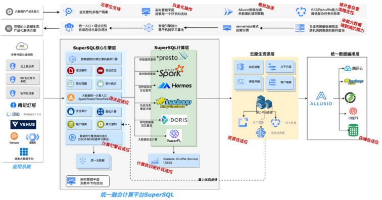 SuperSQL 是腾讯自研的下一代大数据自适应智能计算平台。通过开放融合的架构,实现一套代码高效解决公有云、私有云、内网的任何大数据计算场景问题。我们通过将异构计算引擎 / 异构存储服务、计算的智能化 / 自动化、SQL 流批一体纳入内部自适应闭环,给用户提供极简统一的大数据计算体验。用户能够从繁杂的底层技术细节中解脱出来,专注于业务逻辑的实现,像使用“数据库”一样使用“大数据”,实现业务逻辑与底层大数据技术的解耦。
