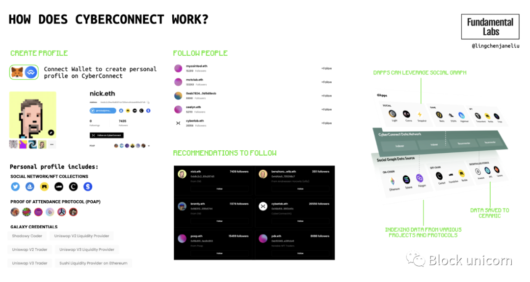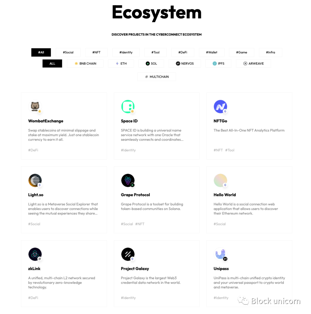 CyberConnect是一个社交图谱协议,允许dapp访问和使用用户提供的社交图谱数据。CyberConnect的生态系统非常强大,集成了很多web3应用,包括Project Galaxy、Mask Network、Light.so、Grape.art、NFTGo、Metaforo、zklink等等。CyberConnect的社交图谱分为两个部分:1)关注按钮;2)关注和关注者列表。Web3应用程序可以直接插入CyberConnect的社交图模块来开发自己的应用程序,这可以帮助解决冷启动问题,也可以将数据所有权还给用户。因此,用户可以使用自己的社交图谱在不同的应用程序之间切换。CyberConnect的解决方案允许用户在所有应用程序中拥有更全面的身份。![]()