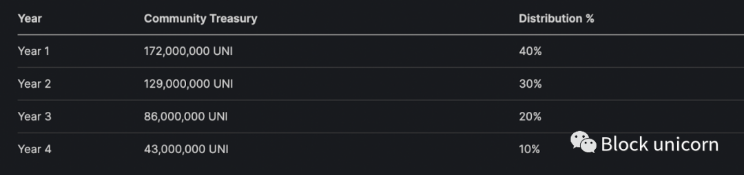 从上图可以看出,所有的UNI,也就是总共10亿的UNI将在2024年9月底分发。起初,Uniswap空投了UNI代币总供应量的15%,相当于1.5亿个代币给历史用户,包括流动性提供者。剩余的4.3亿代币分配给社区,将通过贡献者补助、社区倡议、流动性挖掘和其他项目持续分配。在下面的表格中,你可以看到分配给社区的UNI代币的年度归属时间表。