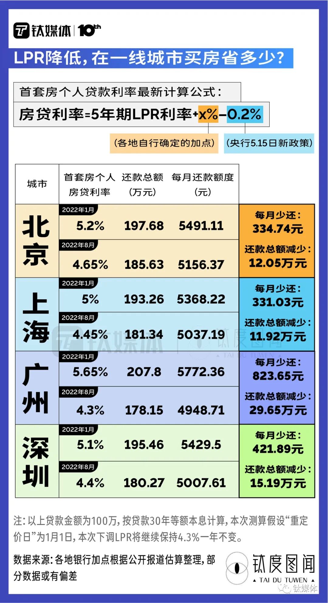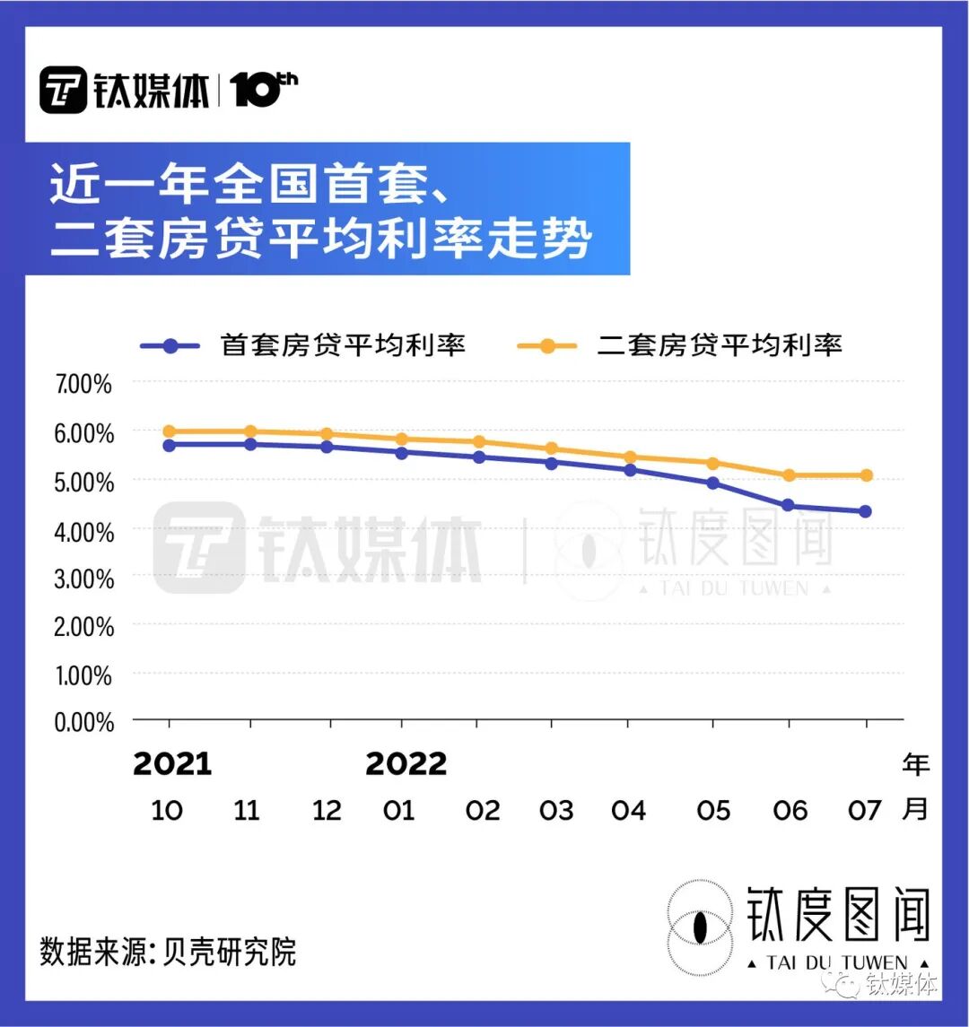 今年1-7月商品房销售额、商品住宅销售价格双双下降,楼市有待回暖。此次LPR下调还透露出稳楼市、稳预期、稳经济的政策目标。据国家统计局数据,2022年以来,商品房销售面积和销售额呈大幅下降趋势,1-7月,商品房销售面积78178万平方米,同比下降23.1%;商品房销售额75763亿元,下降28.8%。2022年以来,据国家统计局发布的70个大中城市新建商品住宅销售价格变动情况统计数据,房价下跌的城市数量超过了房价上涨的城市数量。目前,全国各地已经采取各种方式“救市”。据不完全统计,截止2022年8月中旬,全国已有170个地方城市超400余次出台松绑政策。部分地区为鼓励楼市成交,推出了一系列创新性措施,包括放宽限购、加大公积金购房支持力度、降低购房门槛等措施,这一切都是为了稳房价、稳预期。5年期以上LPR还与个人住房贷款利率挂钩。从2021年第4季度来看,个人住房贷款利率持续下行,为房地产销售回暖提供支撑。未来LPR将如何走?多数业内人士分析认为,下半年经济恢复仍较为温和,房地产市场将在未来一段时间低位运行,LPR仍有下调空间。伴随LPR下调,房贷利率不断下降,贷款总付息减少,这些联动效应能否唤起大家的买房热情?一切还有待观察。数据来源:钛媒体科股宝、东方财富网、贝壳研究院、各地银行加点根据公开报道估算整理、国家统计局、中国货币政策执行报告、公开整理策划制作|钛媒体视觉中心,编辑|刘美兰,作图|初彦墨