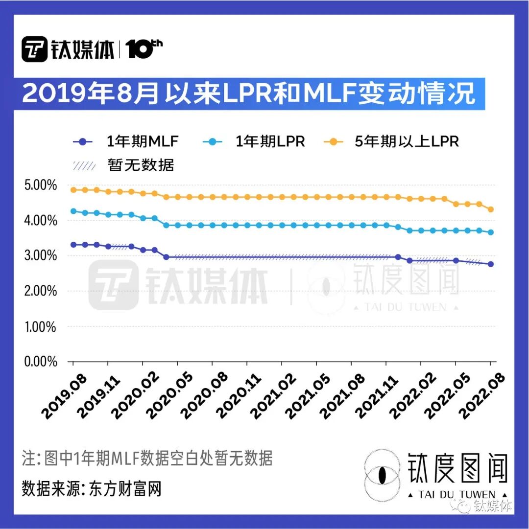 MLF和LPR是央行针对不同期限、不同目标的利率调整工具。MLF指中期借贷便利,是货币调节工具;LPR是指贷款基础利率。可以简单理解为,MLF是央行向银行提供借款的参考利率,是央行借给商业银行的利率;LPR是商业银行把钱借给客户的利率,LPR一般是在MLF的基础上加几个点形成的,如果MLF开始调整,LPR也会跟着调整。8月15日,央行开展4000亿元MLF操作和20亿元公开市场逆回购操作,MLF利率下降10个基点,这被视作LPR下调的先兆。据钛媒体·钛度图闻统计,2019年LPR改革至今,这种现象确实常见。比如,2020年4月,1年期MLF利率下降20个基点后,1年期和5年期LPR也分别下降20BP、10BP。那么,为什么MLF利率下降,LPR也会随之下降?新的LPR形成机制是在MLF利率基础上加点形成的,18家银行每月根据MLF等市场利率报出LPR,去掉最高值和最低值之后形成的价格就是每月公布的LPR利率,LPR利率等于央行公开的MLF利率+18家银行每月报价平均加点。由此可见,MLF利率的变动,一般都会影响到LPR利率,并最终影响贷款利率。因而在MLF利率下调后,很多业内人士预测LPR利率在未来或许联动下降。房贷再减负,首套房贷款利率下调