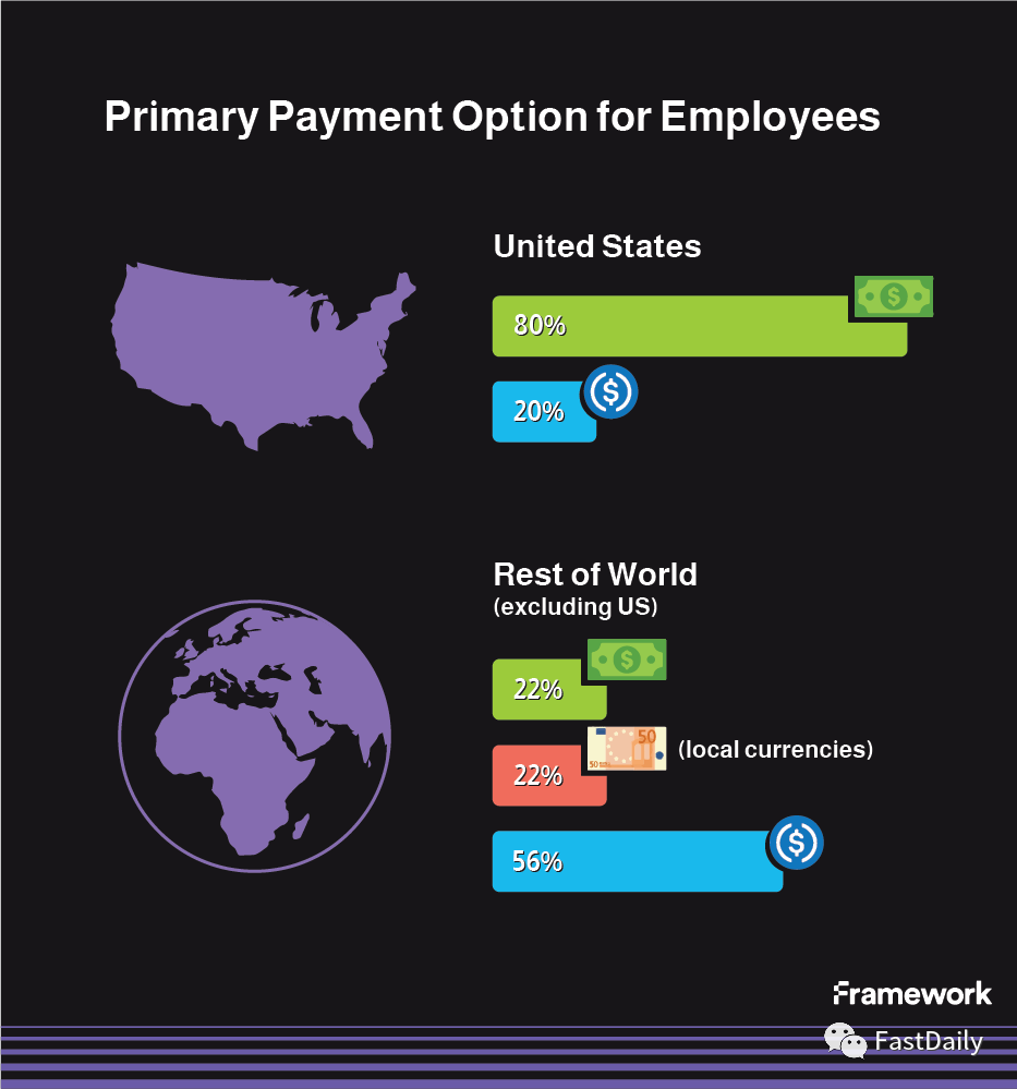对于国际团队来说,情况就大不相同了。约50%的受访公司将USDC或其他稳定币作为所有员工的主要薪酬形式,几乎所有公司都为全职员工和合同工提供了USDC结算的选项。大约一半的跨国公司以美元结算,另一半以其他当地货币结算。