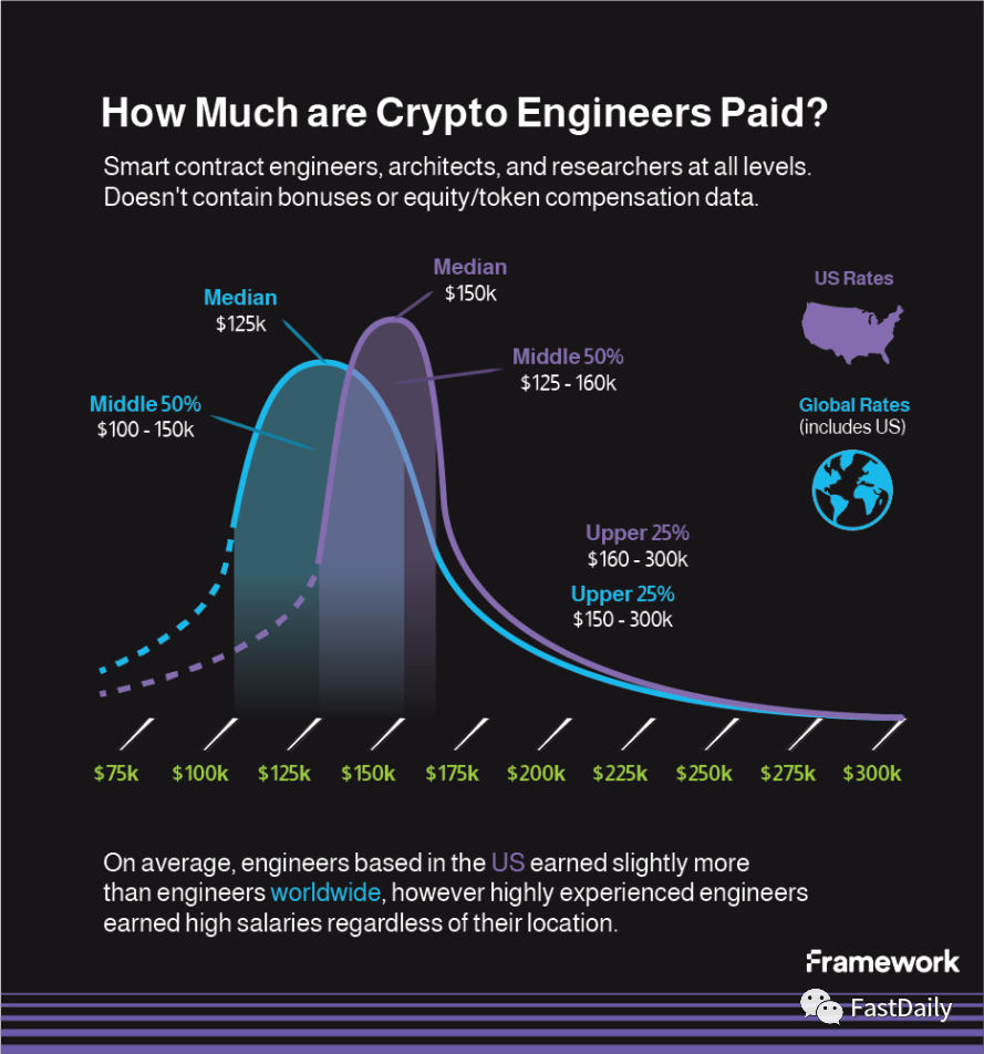 事实上,从基本工资和所有权的角度来看,加密货币工程师的薪酬范围相对较广。在所有工程师岗位中(包括在加密货币公司工作的非加密货币工程师),大多数(>55%)人的薪酬在10-17.5万美元的范围内。年薪低于10万美元的工程师大多在生活成本较低的国家工作。