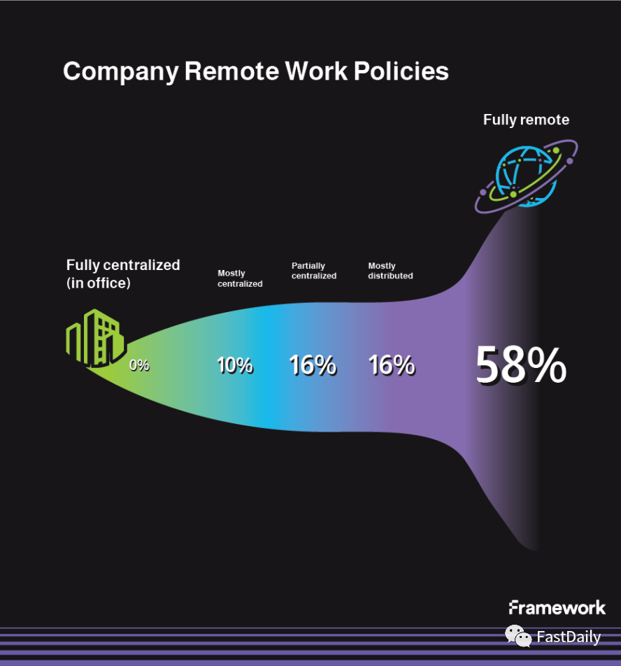大多数受访公司认为自己是“完全分布式”的,并将远程工作作为其业务的主要运营模式。根据我们的调查结果,即使是总部设在美国的公司,也有>33%的员工来自世界各地,鉴于加密货币的全球化,这种操作模式似乎是必要的。处于早期阶段的公司更有可能远程办公,而已经筹集到A轮或B轮的公司或稍有可能拥有一个或多个正式办公室。