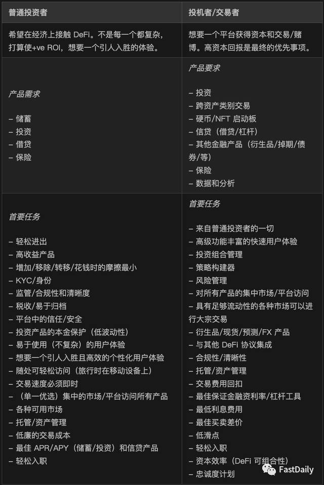 记住我们的用户是一个散户DeFi投资者,让我们看看一些用户需求和痛点: