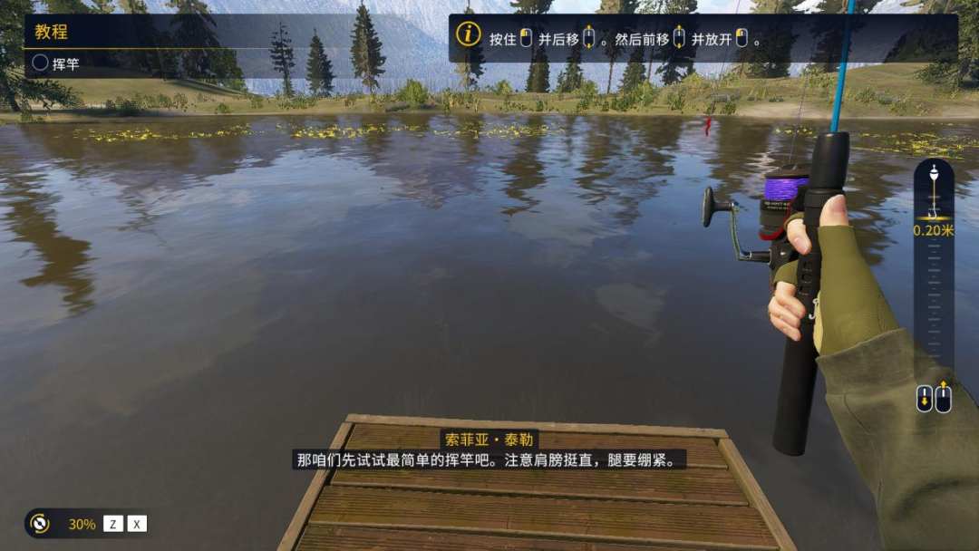 举个例子,游戏中不管你如何控制自己的力道,哪怕只是轻轻一挥,鱼饵也会直接飞出十几米远。想要在近处下杆,就只能选择站的更远。且挥杆模组本身也不算优秀,违和的动作本身并不具备这个距离应有的力量感,这就导致操控的整体手感较为僵硬,不够自如。