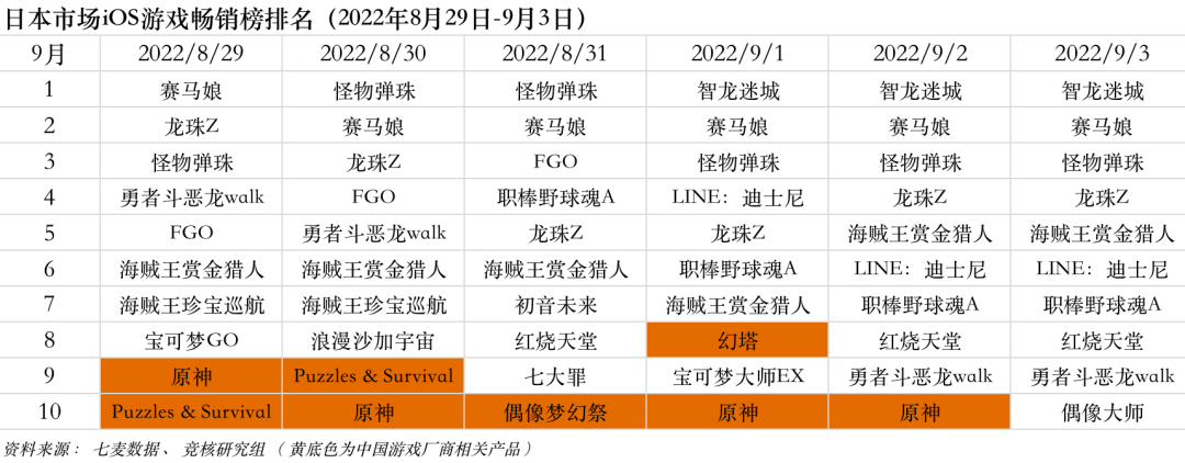 2022年8月29日—9月23日日本iOS游戏类畅销榜中,米哈游《原神》、完美世界《幻塔》、三七互娱《Puzzles & Survival》、乐元素《偶像梦幻祭》等进入榜单。