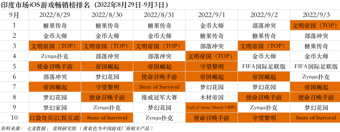 2022年8月29日—9月23日印度iOS游戏类畅销榜中,国产SLG游戏稳定发力。TOP Games《文明帝国》、趣加游戏《State of Survival》、龙创悦动《帝国崛起》《守望黎明》、江娱互动《口袋奇兵》持续在榜。