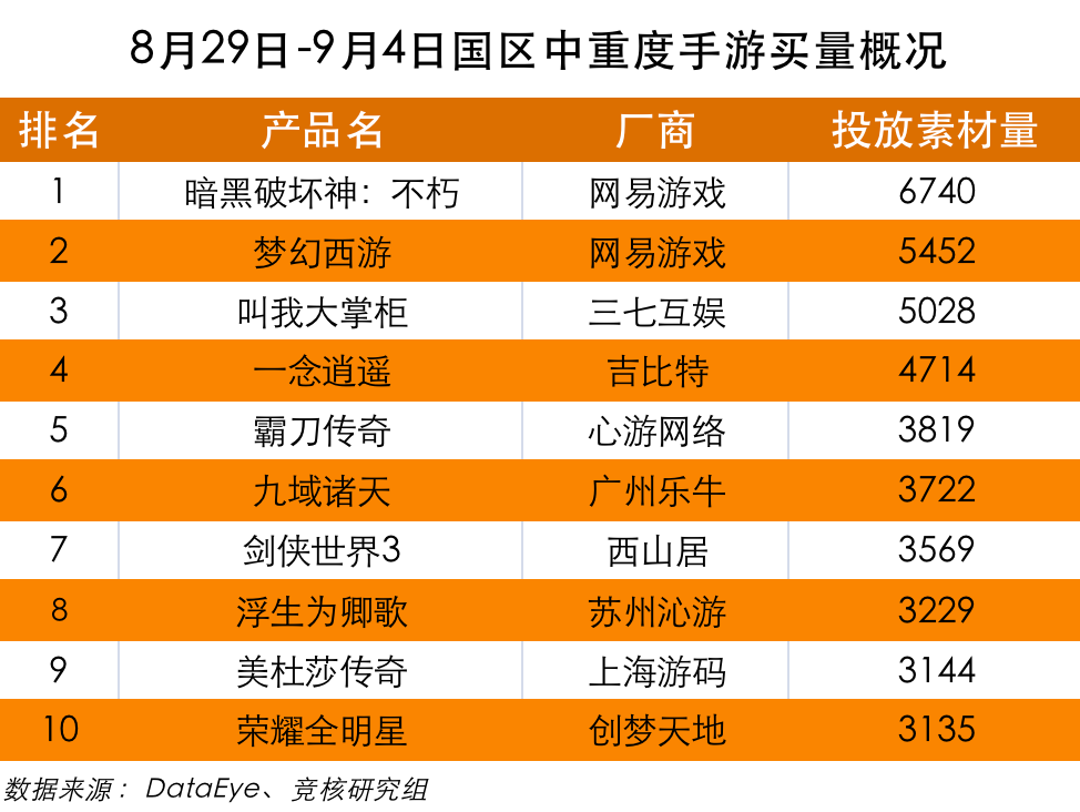 Data-Eye数据显示,2022年8月29日—9月4日国内中重度手游买量榜单中,网易游戏领衔。