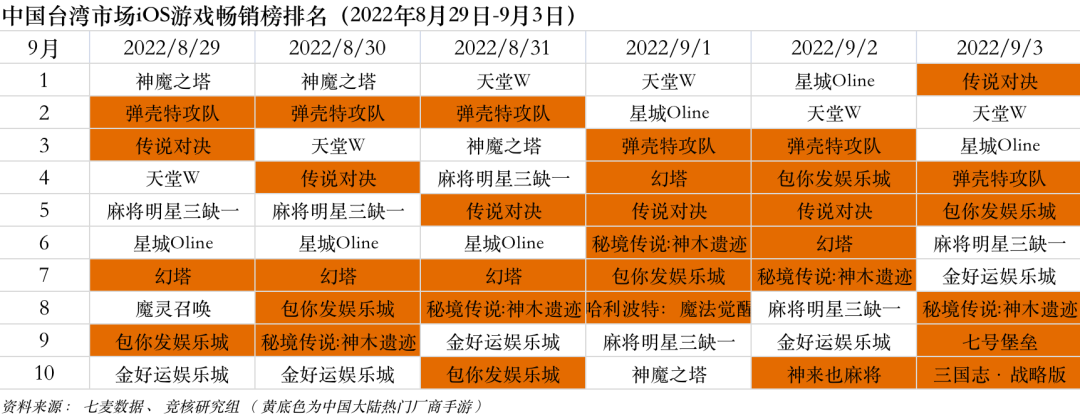 中国台湾市场2022年8月29日—9月23日iOS游戏类畅销榜中,《传说对决》登顶。