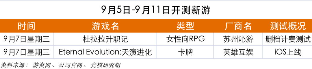 下周(9.5-9.4)开测新游: