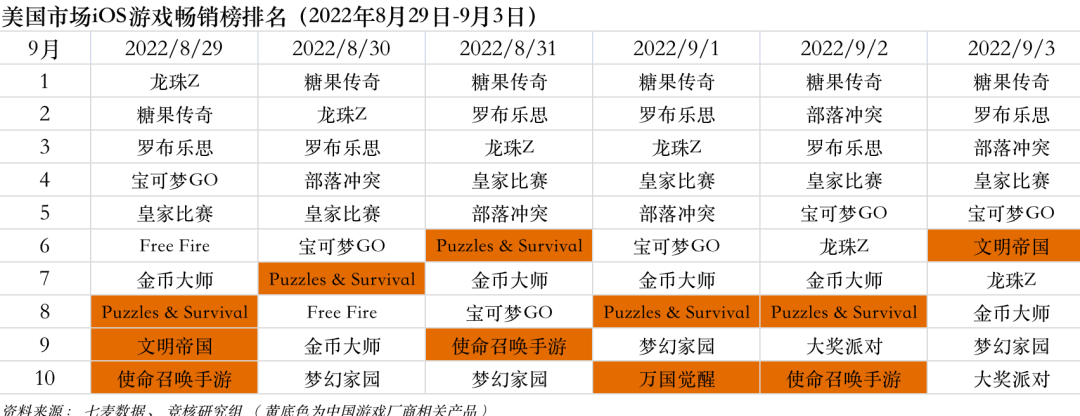 2022年8月29日—9月23日美国iOS游戏类畅销榜中,三七互娱《Puzzles & Survival》稳定在Top10内。
