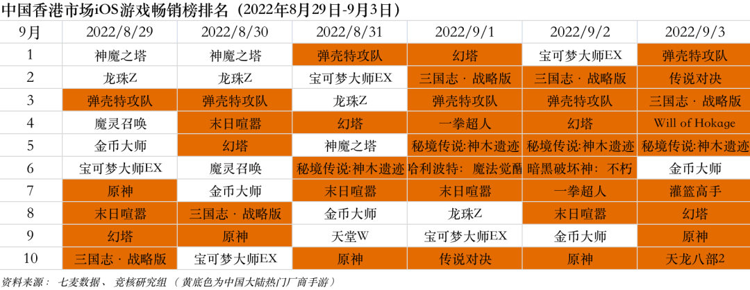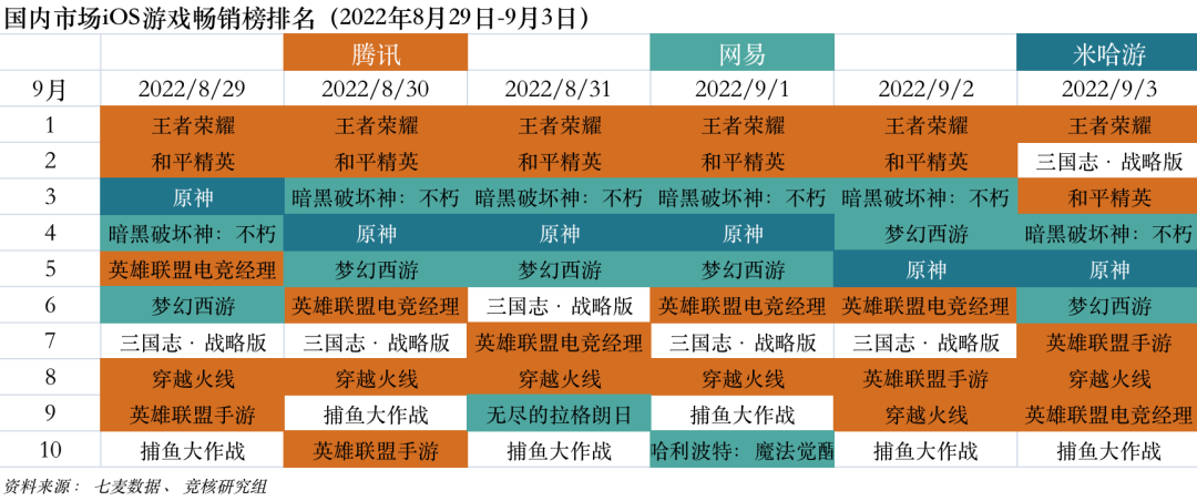中国大陆市场2022年8月29日—9月23日iOS游戏类畅销榜中,腾讯、网易、米哈游旗下旗舰产品稳定在Top5内。