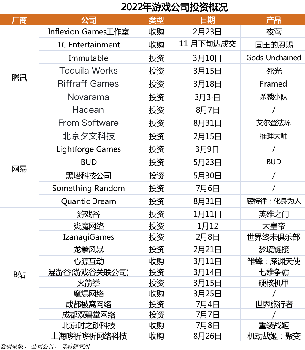 根据竞核不完全统计,截至9月4日,2022年腾讯网易投资手游游戏公司事件分别为8起、6起。此前两家公司多位高层都曾表示,公司游戏业务将朝“国内海外五五开”目标挺进。而通过收购海外知名3A游戏工作室,则是二者拓展海外的重要战略之一。