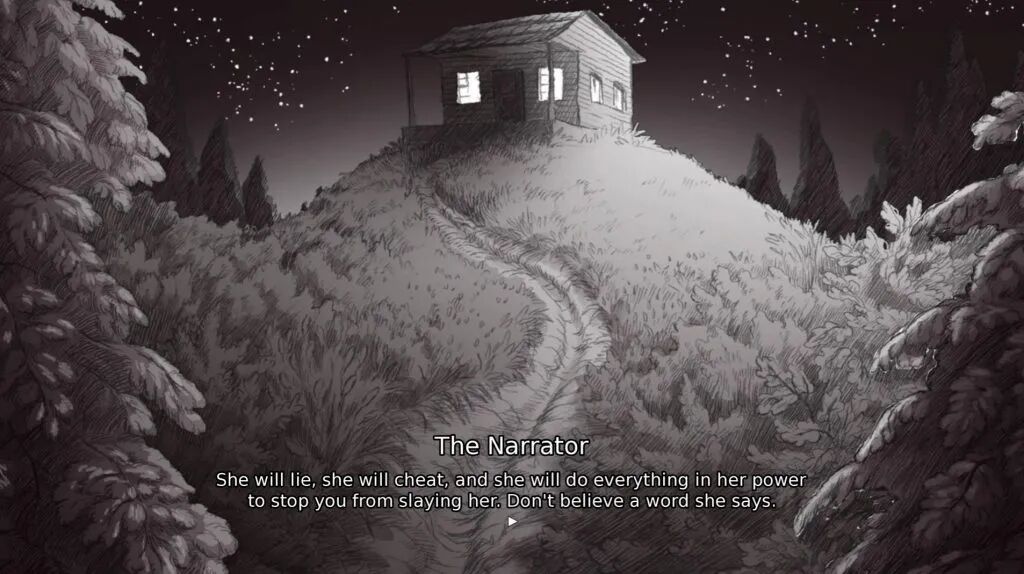 与很多剧情向游戏不同的是,《杀死公主》(demo)的设定、剧情和角色描绘都非常简单,就连故事开头都显得十分草率:你在林间的一条路上,路的尽头是一座小木屋,小木屋的地下室里有一位公主,你来这里不是要拯救公主,而是要杀掉她,如果不这么做,世界就会毁灭……