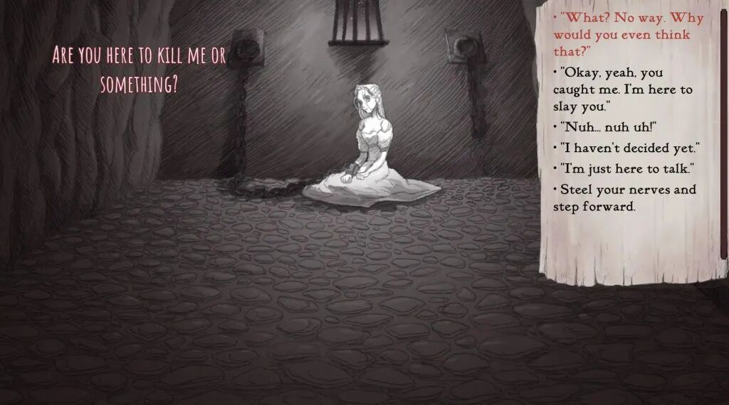每一个选择都会触发不同的对话、引发不同的行动。比较有趣的是,旁白总会想方设法地引导玩家杀掉公主,而被锁住的公主则会花言巧语让你怀疑这么做到底是对是错。