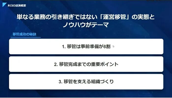 松本启志认为,初期能把业务流程掌握到什么程度决定了转让项目的成败。一开始,Mynet会和原先的运营商沟通,创建一个负责人列表,把项目需要的职位、相关人员、工作范围和所需技能一一列出,并了解是否有需要特定人员才能胜任的工作。