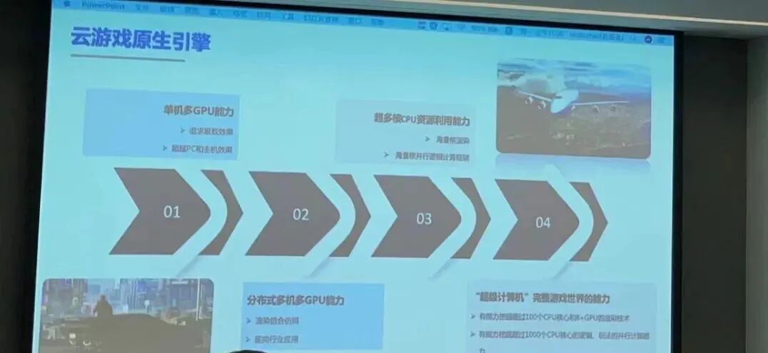 先锋团队预判原生云游戏引擎划分为四大阶段:首先是、单机多GPU能力,主要用于追求极致效果,在移动端打造超过PC和主机的效果;其次是,分布式多GPU能力,主要打磨渲染结合仿真功能,探索非游戏行业应用场景;再次是,超多核CPU资源利用能力,通过海量核渲染,探索打造并行逻辑计算框架;最后是,超级计算机完整游戏世界的能力,需要有能力挖掘超过100个CPU核心和8+GPU的渲染技术,有能力挖掘超过1000个CPU核心的逻辑,玩法的并行计算能力。