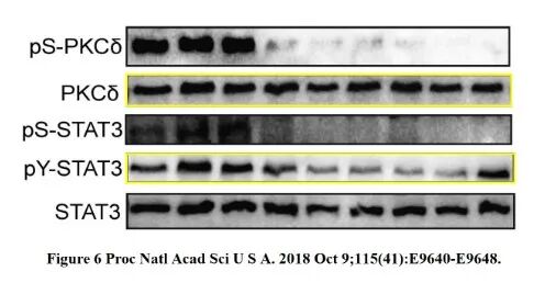 应该有两种凝胶,一种用于检测PKCdelta(总和磷酸化),另一种用于检测 STAT3(总和磷酸化)。但是PKCdelta和pY-STAT3条带非常相似,它们一定来自同一个凝胶。所以文中所说的pY-STAT3信号真的是pS-PKCdelta的信号吗?在这种情况下,正确的pY-STAT3凝胶发生了什么变化,而其他凝胶又到底显示了什么呢?这不可能是「不小心」犯的错误。