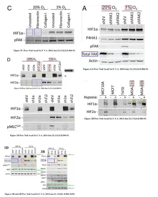 H1F2a凝胶被重复使用,经过一些拼接后,样品标签保持不变,除了标了红框的那个。那么问题来了:为什么作者是重复使用了凝胶,而不是加载控制肌动蛋白,或H1F1a或pMLC呢?也许是因为这两个数字显示的结果略有不同?