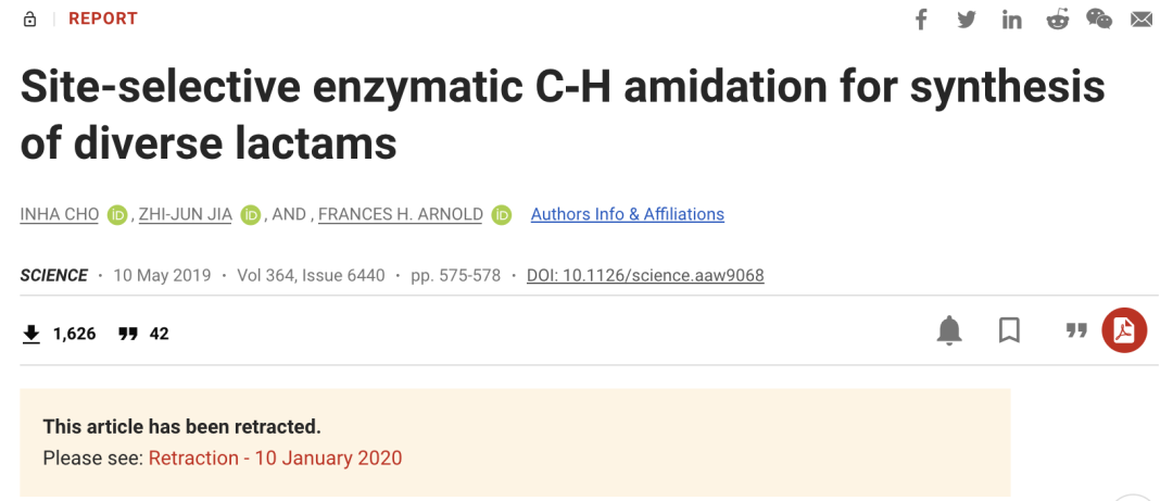 比如,2018年诺贝尔化学奖得主Frances Arnold在无法重复推出实验结果后,宣布撤回自己于2019年5月发表在 Science上的论文Site-selective enzymatic CH amidation for synthesis of diverse lactams。
