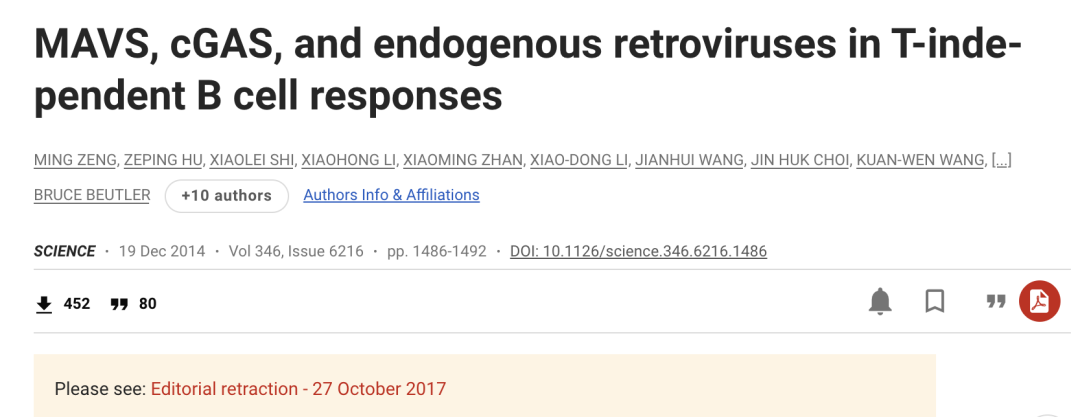 此外,还有2011年诺贝尔生理学或医学奖得主Bruce Beutler在Science发表的题为MAVS, cGAS, and endogenous retroviruses in T-independent B cell responses文章,因后续数据存在问题,也将其稿件撤回。