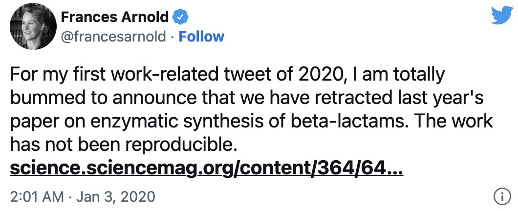 「2020年我发布的第一篇与工作有关的推文,很遗憾地宣布我们已撤回了去年有关酶促合成β-内酰胺的论文。因为这个结果并不具有可重复性。」