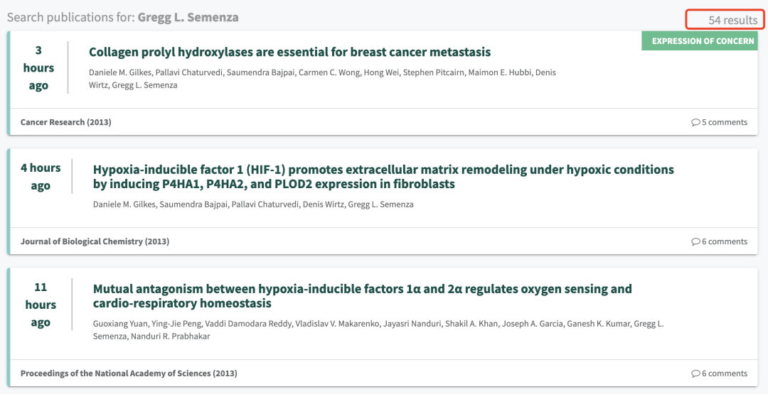 目前,PubPeer上,Semenza共有54篇被质疑的论文。
