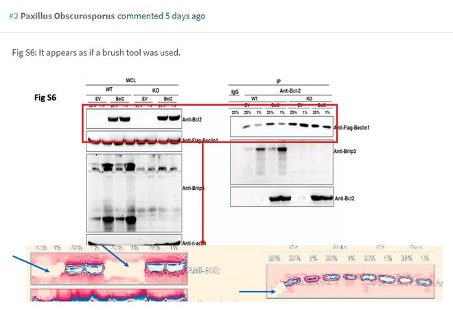 可以看到,图 1A 中有两条凝胶条带很可能是复制粘贴的。图6在完全不相关的实验中用了同样的样本。从条带形状和间距来看,β-肌动蛋白印迹与图 B 和 G 中显示的凝胶都不匹配。
