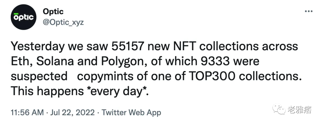 通常,购买 NFT 是那些对加密货币感兴趣的个人在进入更广泛的 web3 生态系统之前采取的第一步。这是购买数字资产的一种有趣而简单的方式,同时支持艺术家并成为更大社区的一部分。不幸的是,许多热切的加密新手——以及现有的买家——越来越容易受到欺诈和诈骗的影响,尤其是在 NFT 市场中非常明显。因为数字艺术可以很容易(轻微地)改变、复制,然后在链上铸造,所以有时很难辨别哪些作品是合法的——尤其是当这些艺术品在备受买家信任的市场上上市时。尽管如此,令人兴奋的是:在 2021 年第一季度,NFT 销售额超过20 亿美元。此外,大约一半所有 NFT 的销售额都低于 200 美元,这表明许多买家愿意投入较少的资金来成为社区的一部分,并希望从中获利。然而,据 Optic 称,约 90% 的 NFT 在 OpenSea 上交易,但该领域充斥着欺诈行为——例如, OpenSea 上80%的 lazy mints 都是骗局。这一事实阻止了许多买家购买 NFT(甚至是他们非常喜欢的 NFT),因为平台上存在很高的欺诈可能性。Optic 旨在通过使用人工智能引擎来监控新mint 的 NFT 并将它们与市场网站上现有的合法收藏进行比较来解决这个问题。