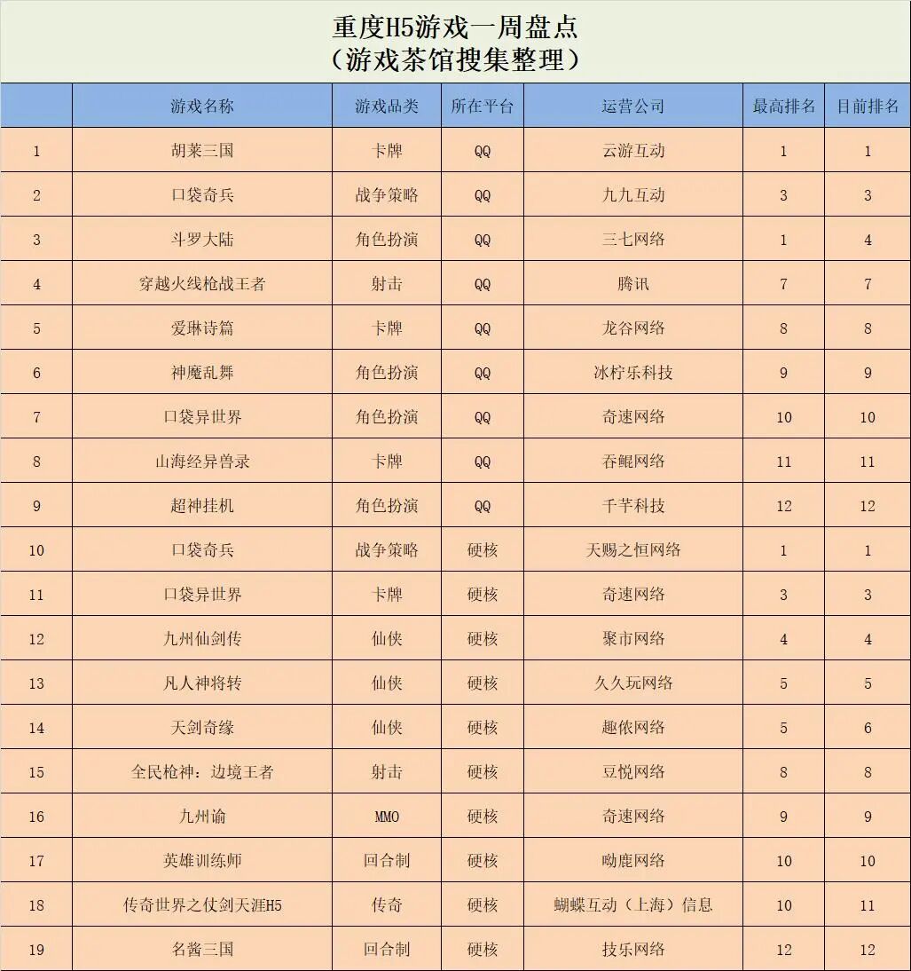重度游戏方面,在QQ小游戏畅销榜单中,云游互动的卡牌游戏《胡莱三国》重回榜首,九九互动《口袋奇兵》和三七网络的《斗罗大陆》分别位列QQ重度游戏榜单第2和第3名。同时,龙谷网络《爱琳诗篇》本周排名明显上升,并于本周重回QQ畅销榜单前列,且其当前位于QQ畅销榜单第8名。