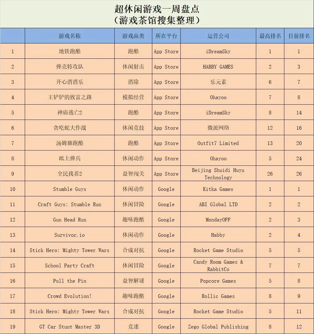 超休闲游戏方面,在App Store免费游戏榜单中,《地铁跑酷》持续第22天稳霸榜单TOP1,海彼游戏发行的《蛋壳特攻队》重稳坐App Store免费游戏榜单TOP3;Google Play免费游戏榜单中,动作类游戏《Stumble Guys》连续第二周稳坐榜首。