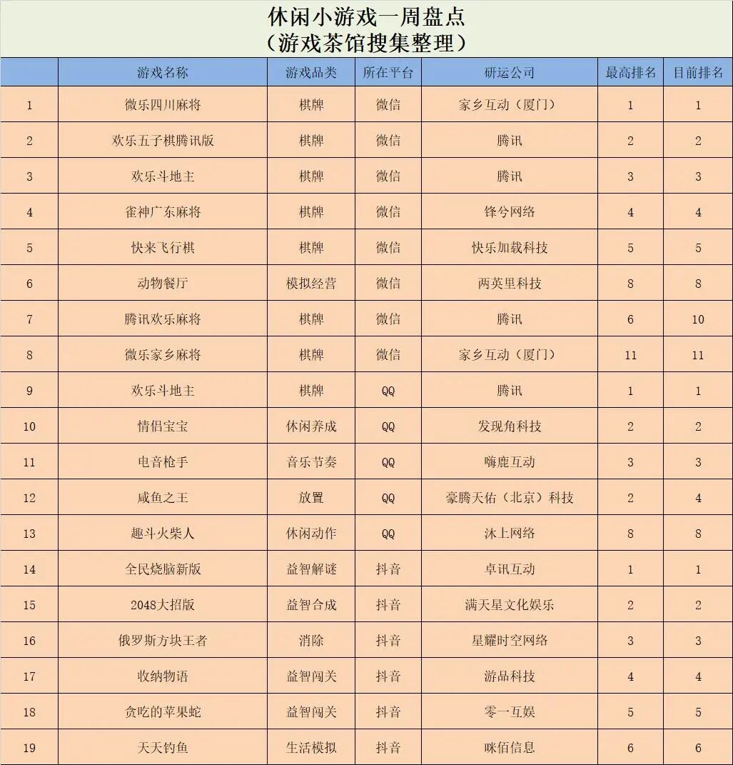 休闲新游周报每周统计微信小游戏、QQ小游戏、抖音小游戏、硬核小游戏以及App Store和Google Play上的新游爆款,并按照分类制作表格,将游戏排名情况等信息公布,希望给到行业同侪帮助。