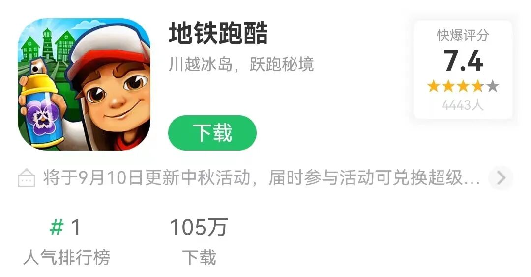 《地铁跑酷》作为一款已经上线了10年的经典老游,在开发者和发行团队的持续更新和用心运维下,如今依然保持着超高的热度,在本次内容更新之后,《地铁跑酷》不仅迅速冲上iOS免费榜单TOP1,还同时拿下了好游快爆人气榜TOP1。