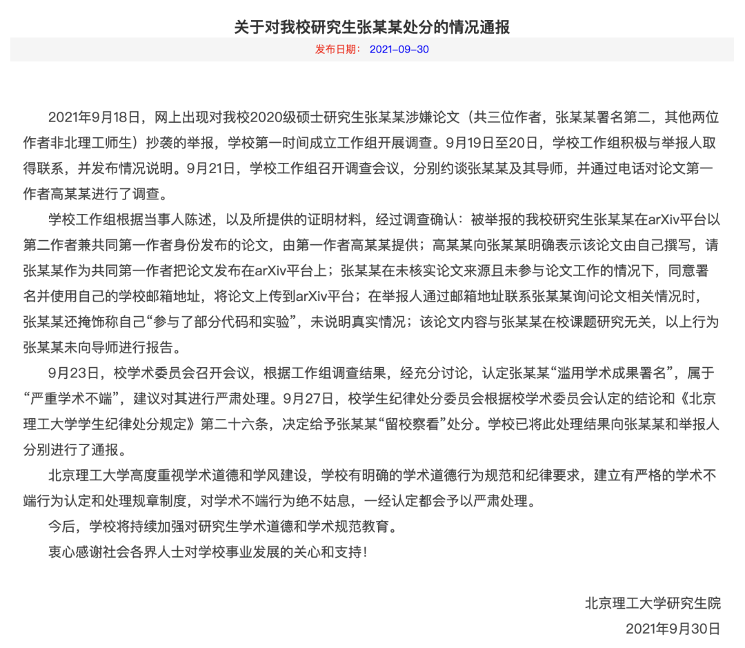 同时,北理工通报张某某严重学术不端问题,并决定给予留校察看处分。