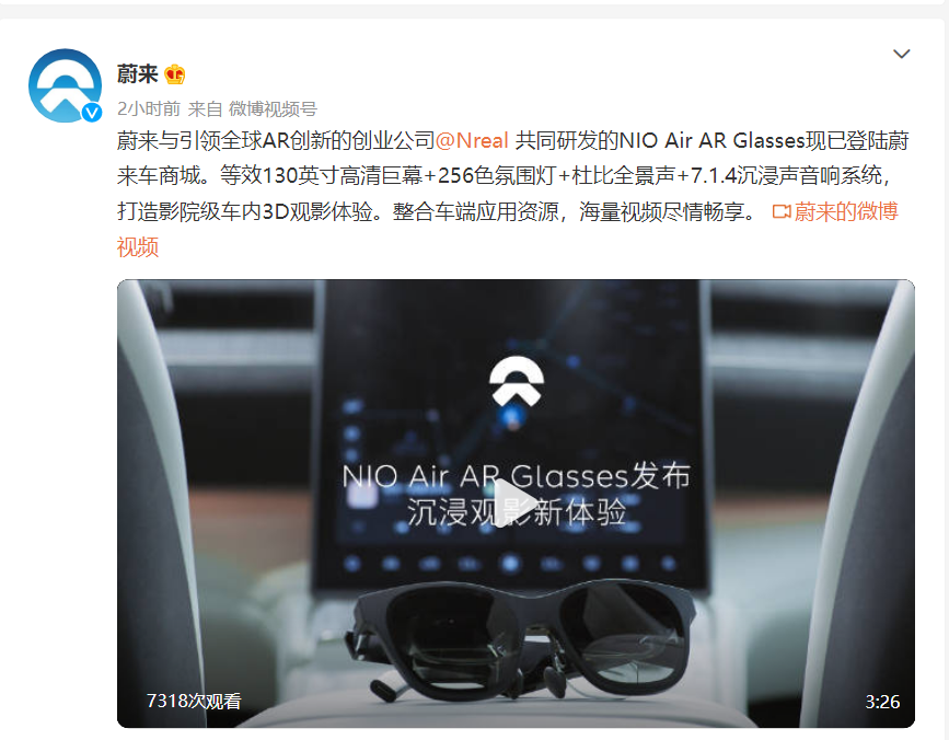 今日,据@蔚来 官方的消息,蔚来与AR创业公司 Nreal 共同研发的 NIO Air AR Glasses 现已登陆蔚来车商城,带来等效 130 英寸高清巨幕 + 256 色氛围灯 + 杜比全景声 + 7.1.4 沉浸声音响系统,打造影院级车内 3D 观影体验。