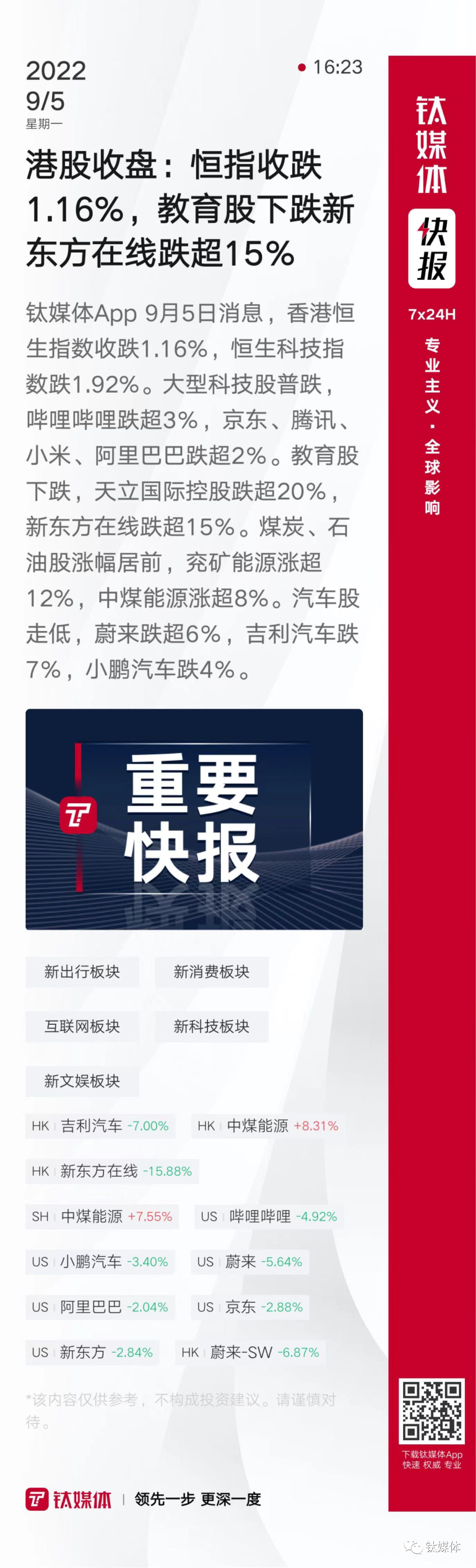 【港股收盘:恒指收跌1.16%,教育股下跌新东方在线跌超15%】